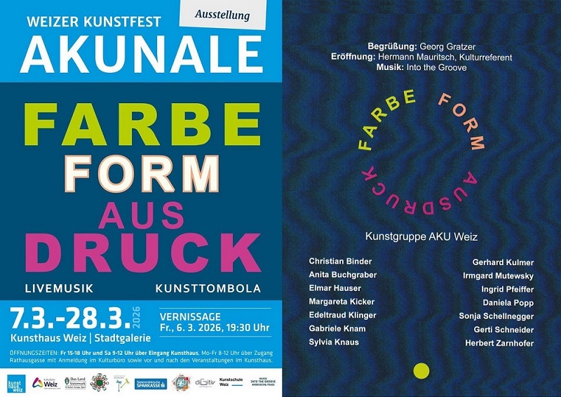 Weizer Kunstfest AKUNALE 'WEISS'vom 13.03. - 29.03.2025 im Kunsthaus Weiz Stadtgallerie | Klicken sie auf das Bild, um es in der ganzen Größe zu sehen! Hier Klicken, um den Flyer herunterzuladen |