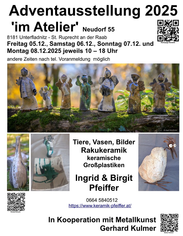 - 2023 Gartenfest Gleisdorf, 28. Mai 2023 im forumKLOSTER-PARK, Gartenausstellung 2023 im eigenen Garten und Weizer Kunstfest AKUNALE, Festival am Schelchenberg, 12.08. Sonntag 13.08.2023 - unsere Totems waren mit dabei, Weihnachtsausstellung 2023 'Keramische Kleinigkeiten' im Keramikstadl